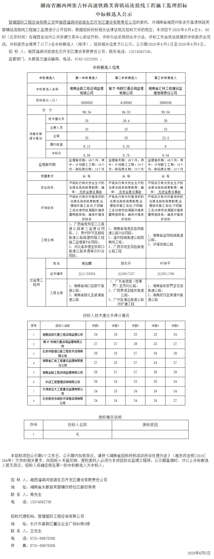湖南省湘西州张吉怀高速铁路芙蓉镇站连接线工程施工监理中标候选人公示