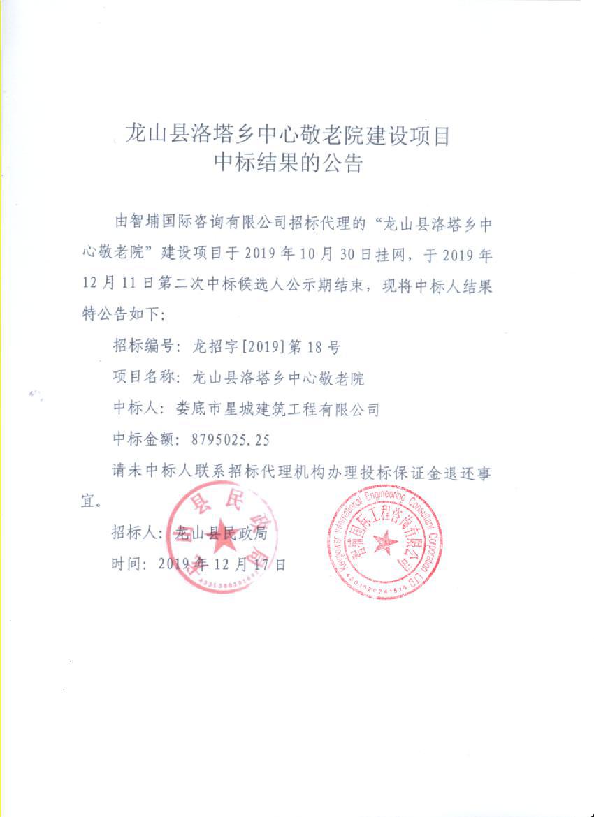 龙山县洛塔乡中心敬老院建设项目中标结果的公告