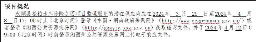 1、采购项目名称:永顺县松柏水库除险加固项目监理服务