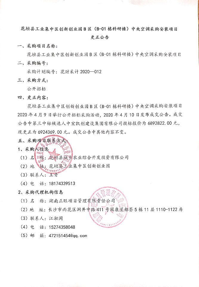 [更正公告]花垣县工业集中区创新创业园B区(B-01栋科研楼)中央空调采购安装项目中标更正公告