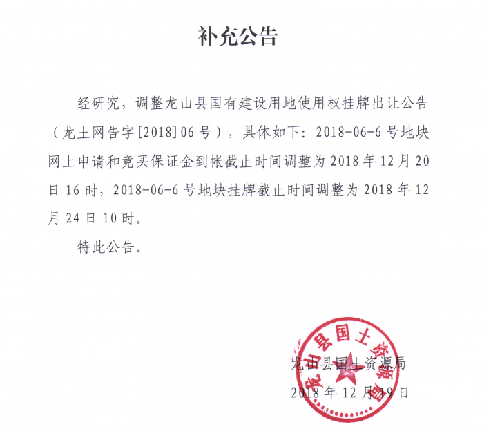 龙山县2018-06-6号地块国有建设用地使用权(变更公告)