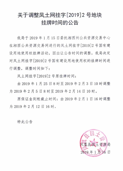 凤凰县国土资源局[2019]2号地块国有建设用地使用权(变更公告)