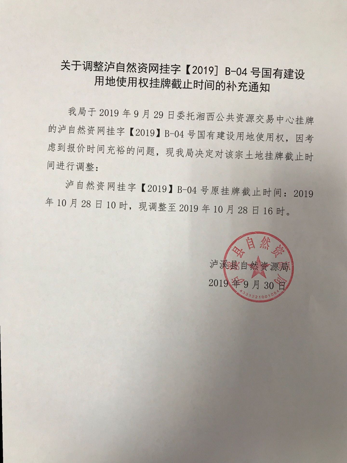 泸溪县自然资源局2019B-04号地块国有建设用地使用权(变更公告)