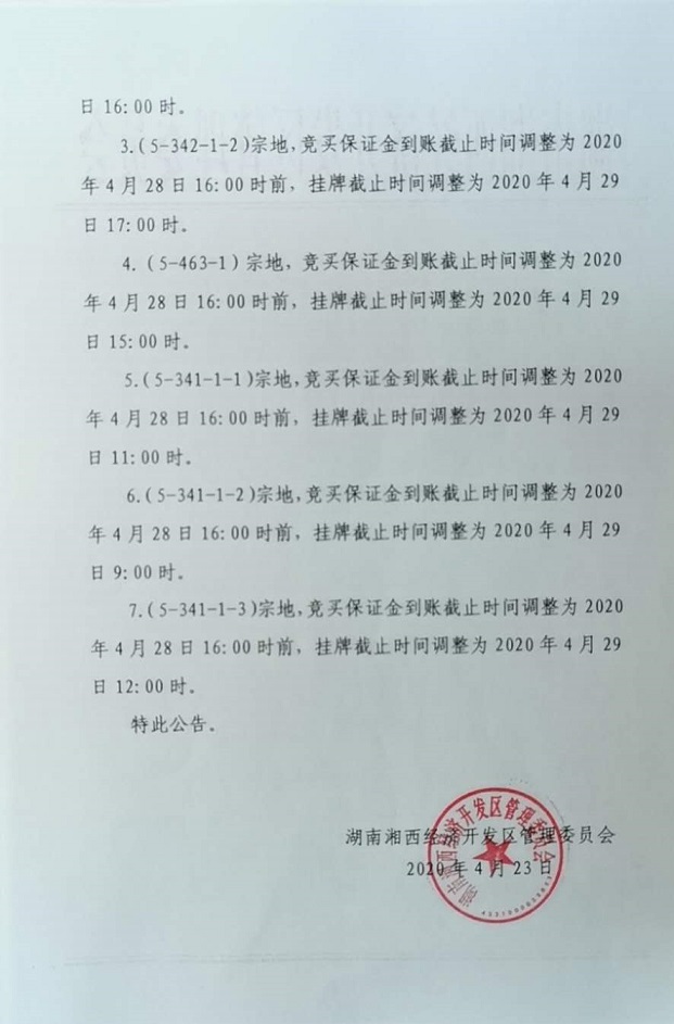 湘西经济开发区管委会(5-341-1-1)地块国有建设用地使用权(延期公告)