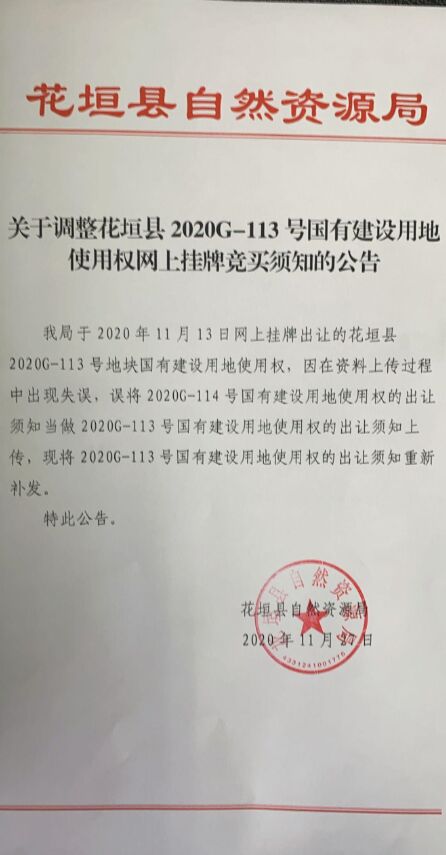 花垣县2020G-113号地块国有建设用地使用权(变更公告)