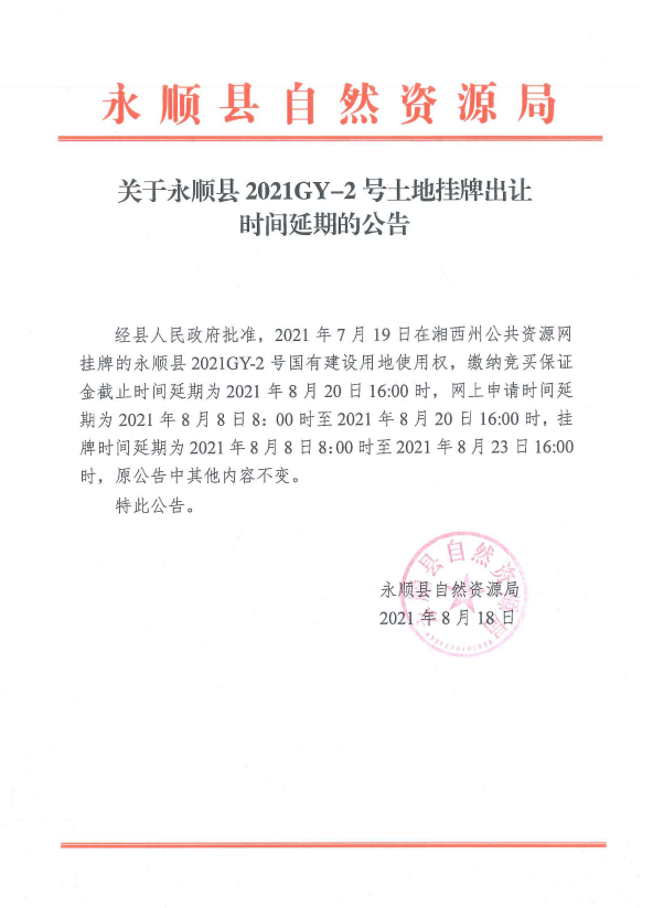 永顺县2021GY-2号国有建设用地使用权(延期公告)