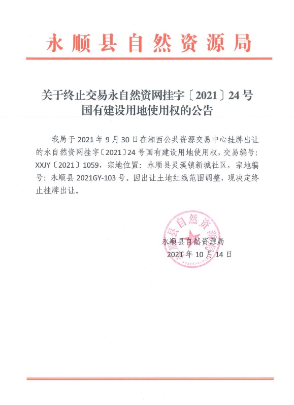 永顺县2021GY-103号国有建设用地使用权(终止公告)