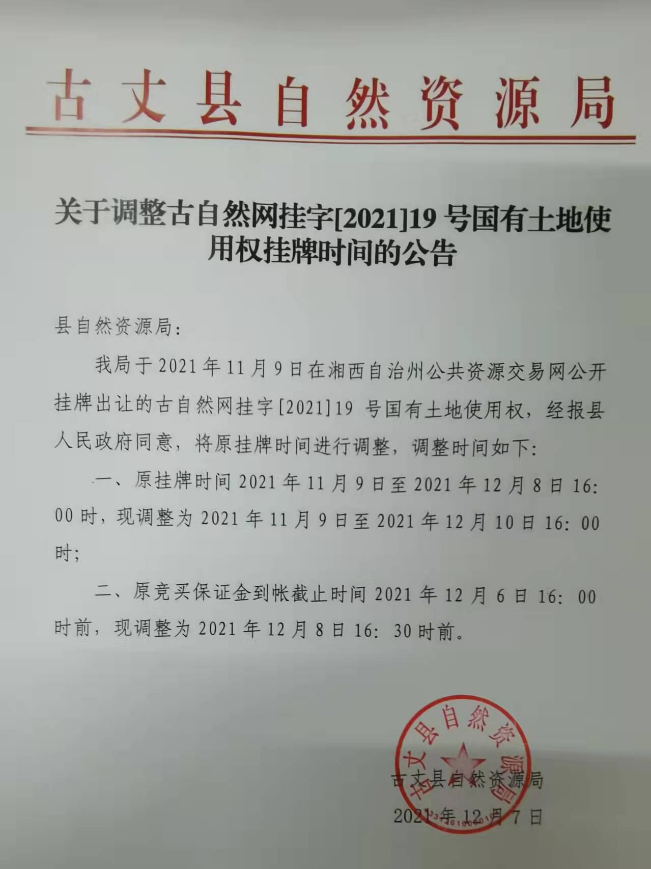 古丈县自然资源局[2021]19号地块国有建设用地使用权(延期公告)