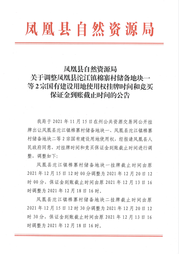 凤凰县沱江镇棉寨村储备地块一国有建设用地使用权(延期公告)