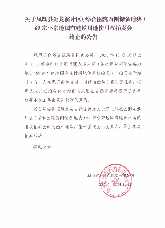 凤凰县廻龙溪片区(综合医院西侧储备地块)69宗小宗地国有建设用地使用权终止公告