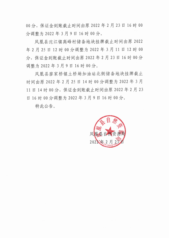 关于调整凤凰县星城住宅小区东南侧储备地块等4宗宗国有建设用地使用权挂牌时间和竞买保证金到账截止时间的公告.pdf