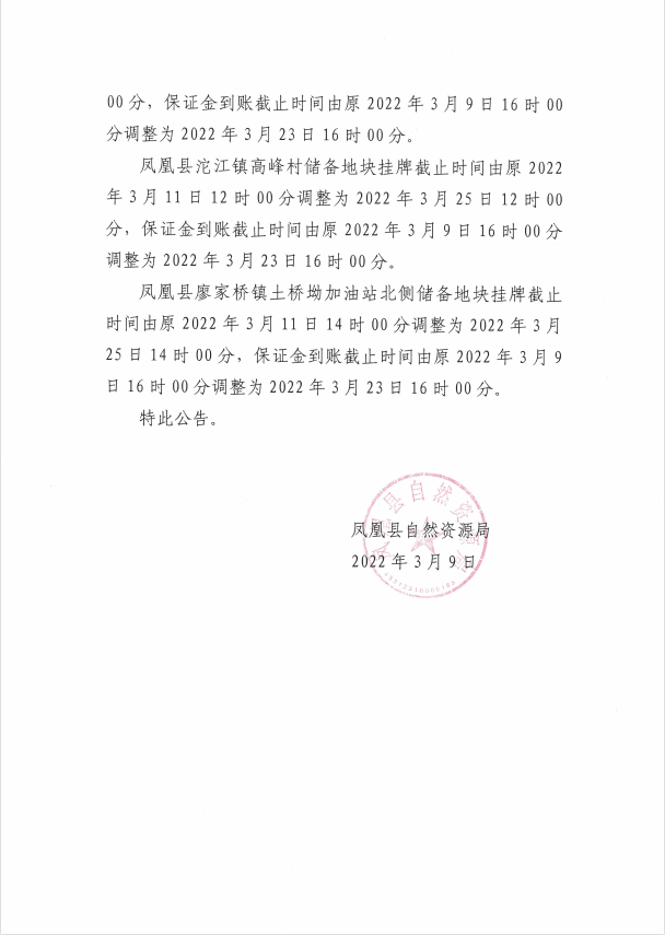 关于调整凤凰县星城住宅小区东南侧储备地块等4宗国有建设用地使用权挂牌时间和竞买保证金到账截止时间的公告.pdf