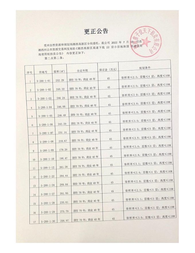 湘西高新区高速下线22宗小宗地块国有建设用地使用权(更正公告)
