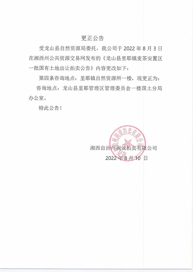 龙山县里耶镇麦茶安置区一批国有土地出让(变更公告)