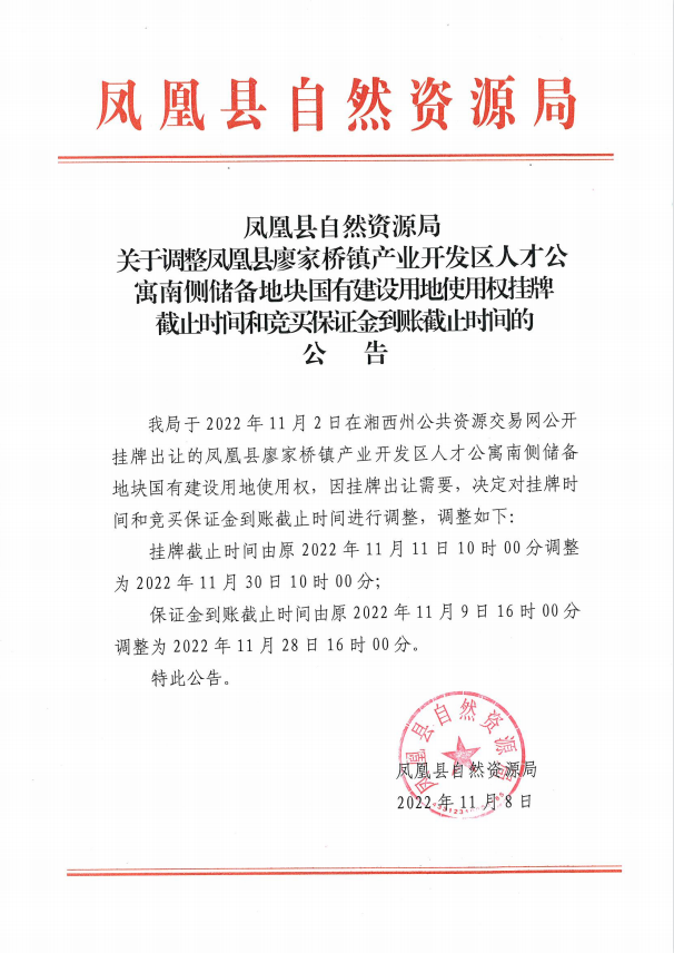 凤凰县廖家桥镇产业开发区人才公寓南侧储备地块国有建设用地使用权(延期公告)