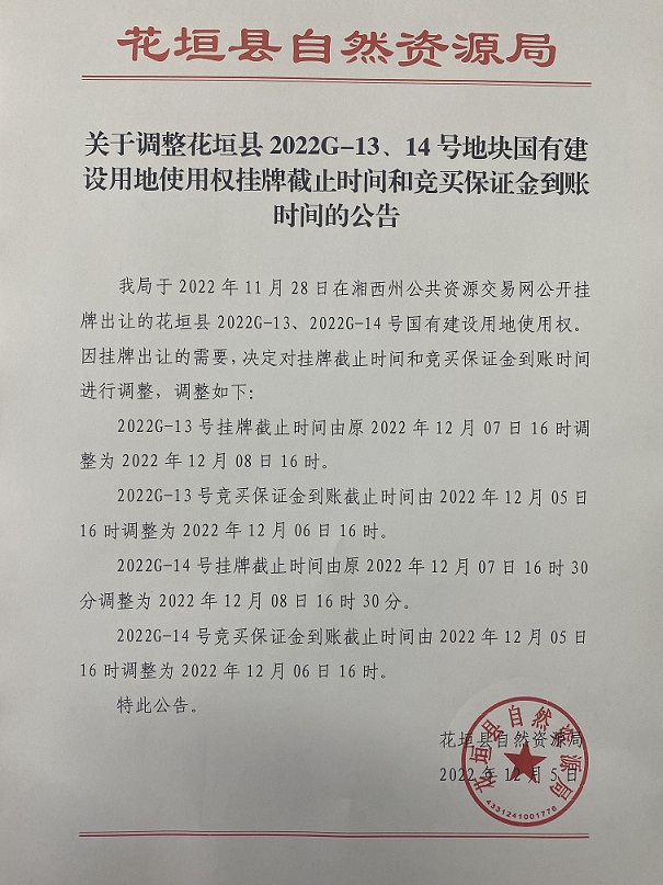 花垣县2022G-13号地块国有建设用地使用权(延期公告)