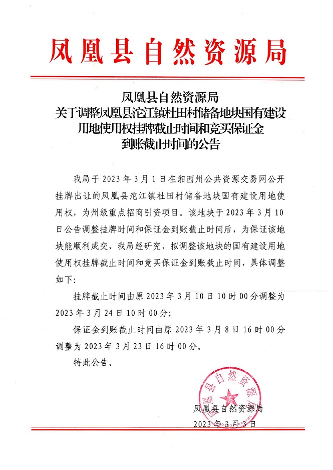 凤凰县沱江镇杜田村储备地块国有建设用地使用权(延期公告)
