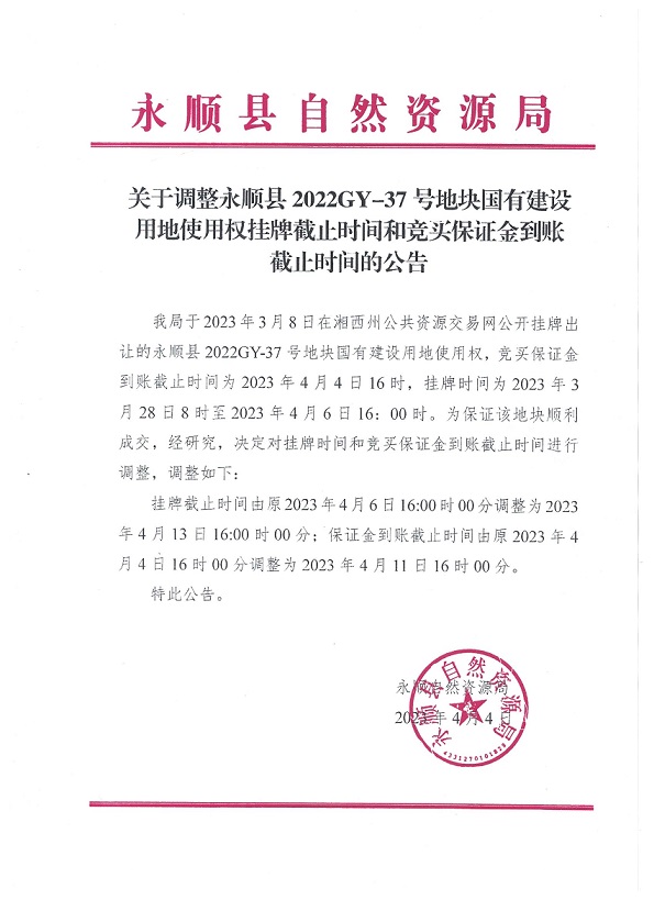 永顺县2022GY-37号国有建设用地使用权(延期公告)