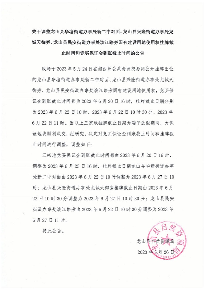 龙山县兴隆街道办事处龙城天御旁国有建设用地使用权(延期公告)