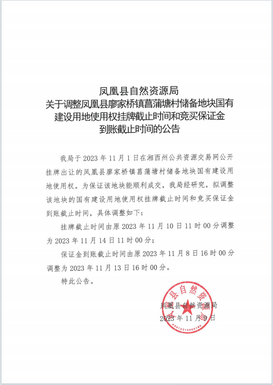 凤凰县廖家桥镇菖蒲塘村储备地块国有建设用地使用权(延期公告)
