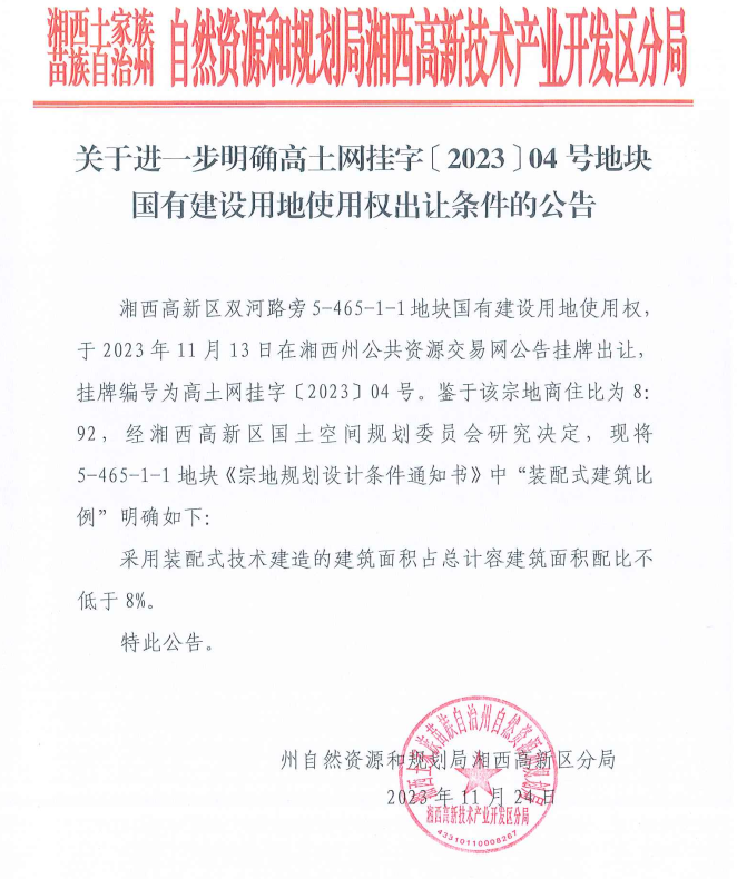 湘西高新区管委会(5-465-1-1)地块国有建设用地使用权(变更公告)