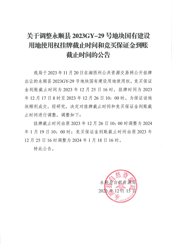 永顺县2023GY-29号国有建设用地使用权(延期公告)