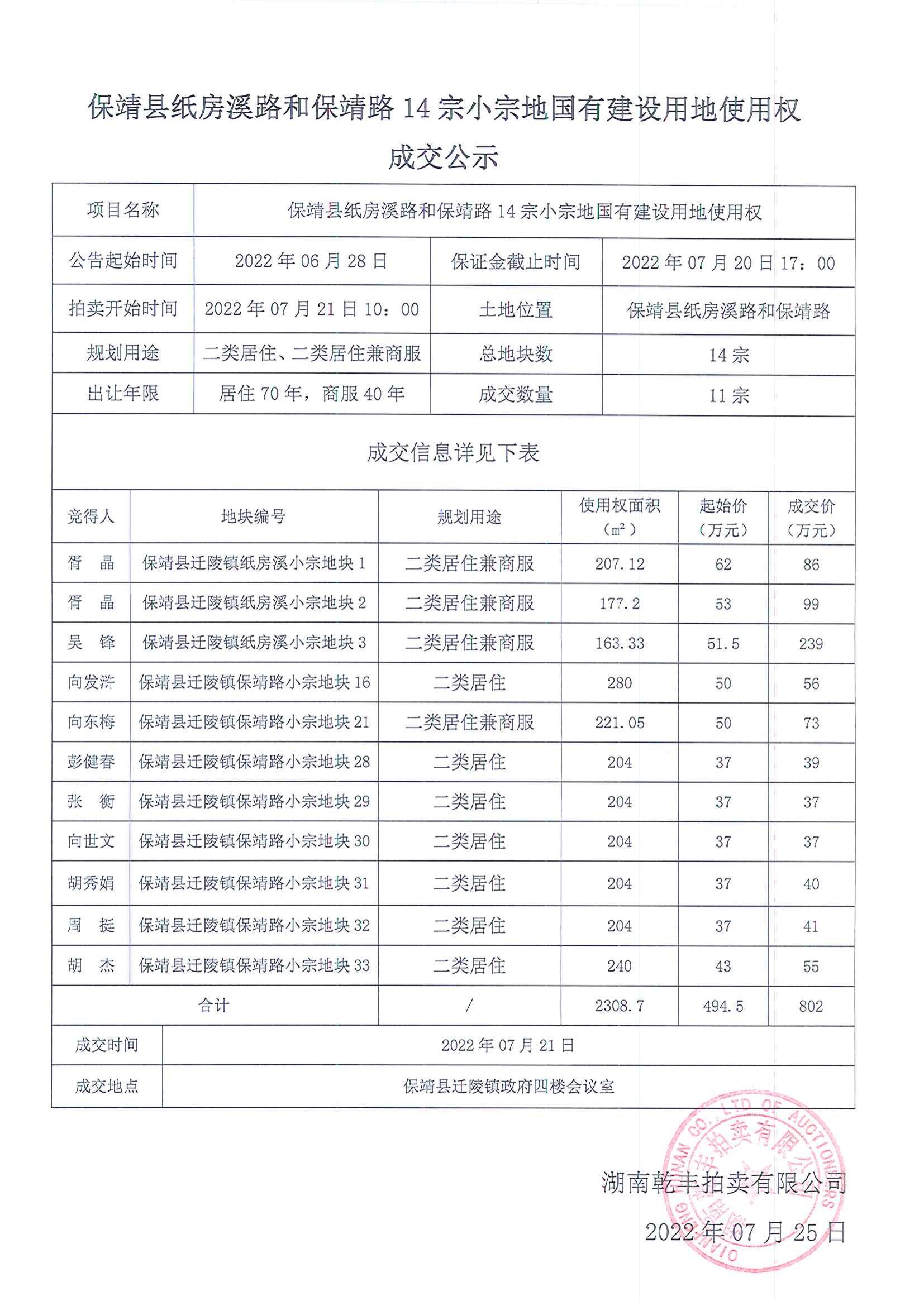 保靖县纸房溪路和保靖路14宗小宗地国有建设用地使用权成交公示