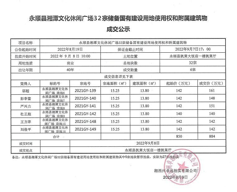 永顺县湘潭文化休闲广场32宗储备国有建设用地使用权和附属建筑物成交公示