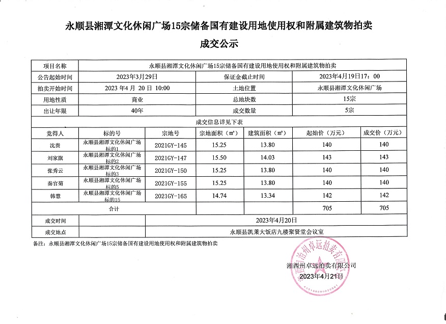永顺县湘潭文化休闲广场15宗储备国有建设用地使用权和附属建筑物拍卖成交公示