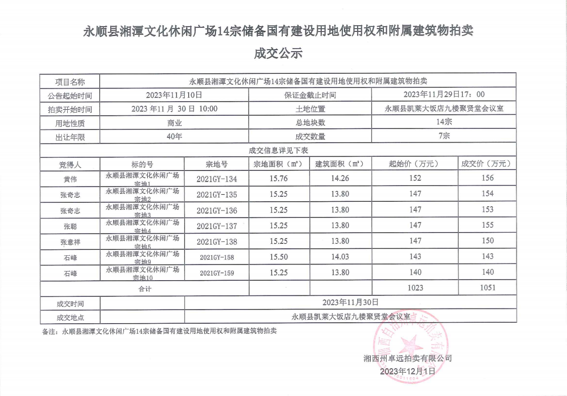 永顺县湘潭文化休闲广场14宗储备国有建设用地使用权和附属建筑物拍卖成交公示