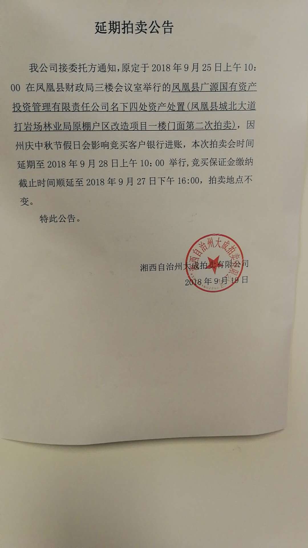 我公司接委托方通知,原定于2018年9月25日上午10:00在凤凰县财政局三楼会议室举行的凤凰县广源国有资产投资管理有限责任公司名下四处资产处置(凤凰县城北大道打岩场林业局原棚户区改造项目一楼门面第二次拍卖),因州庆中秋节假日会影响竞买客户银行进账,本次拍卖会时间延期至2018年9月28日上午10:00举行,竞买保证金缴纳截止时间顺延至2018年9月27日下午16:00,拍卖地点不变。