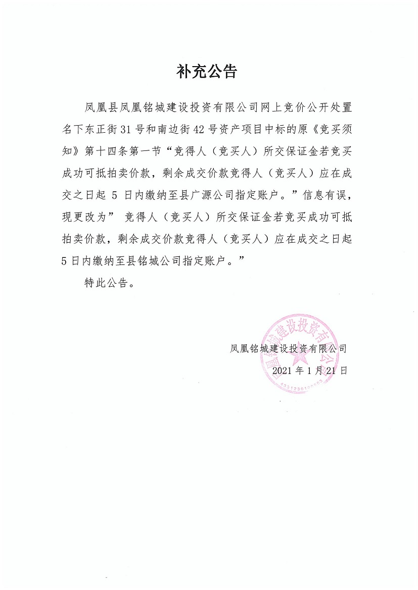 [变更公告]凤凰县凤凰铭城建设投资有限公司网上竞价公开处置名下东正街31号和南边街42号资产