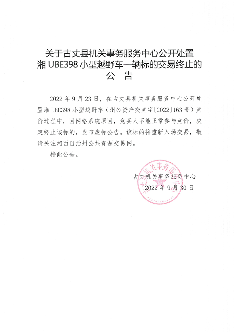 关于古丈县机关事务服务中心公开处置湘UBE398小型越野车一辆标的交易终止的公告.pdf